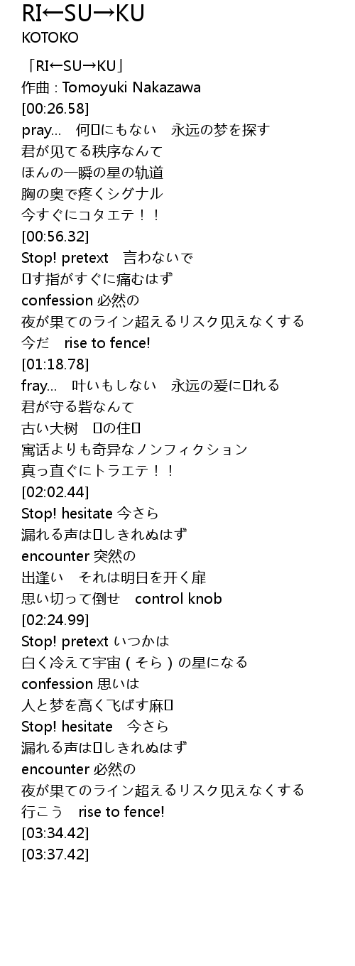 | [03:17.28] | 夜が果てのライン超えるリスク见えなくする |