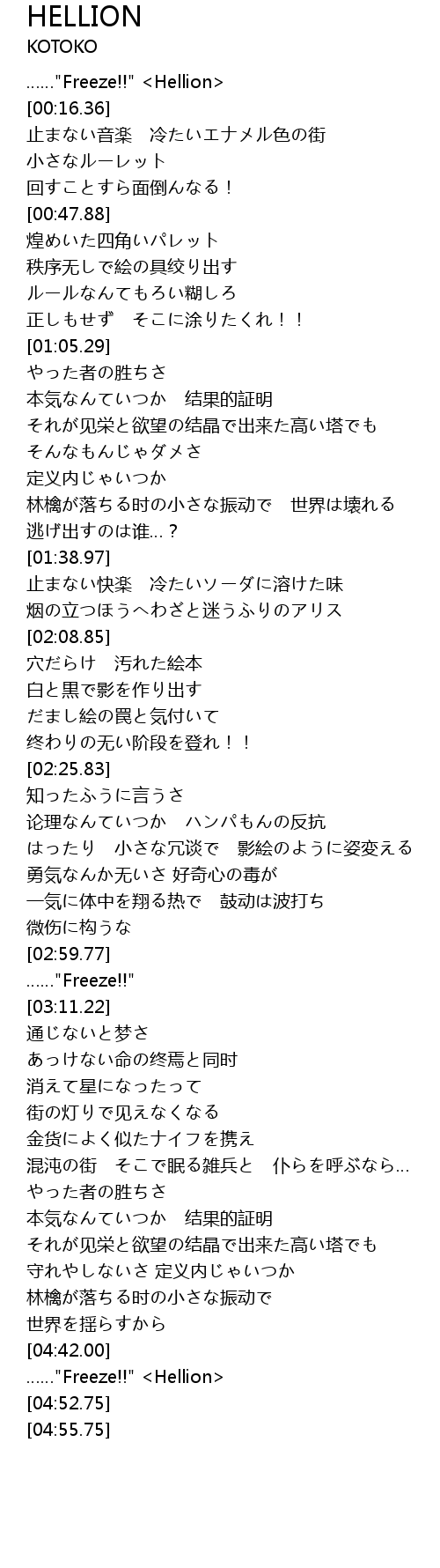 | [04:50.89] | ……"Freeze!!" <Hellion> |