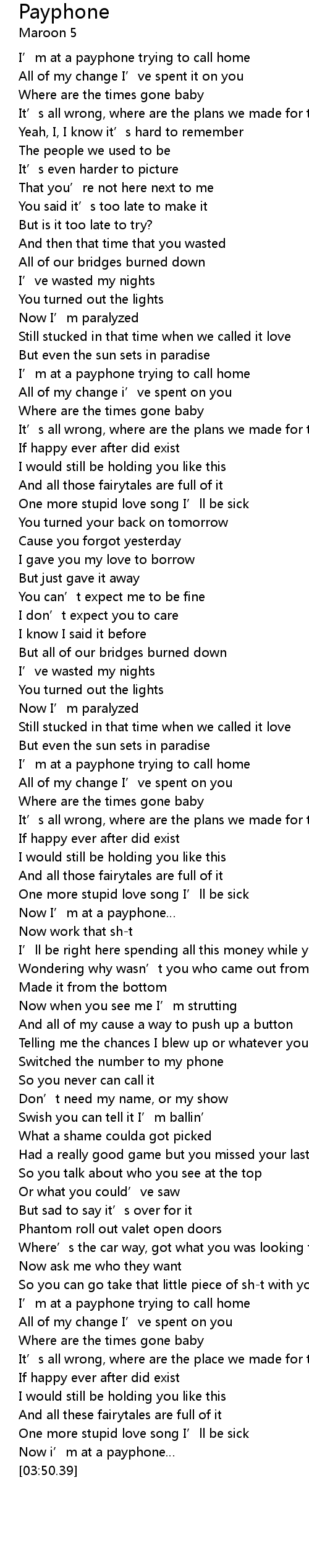 | [00:52.57] | I' m at a payphone trying to call home |