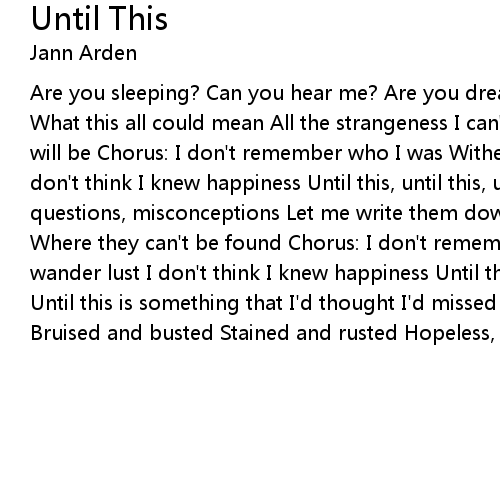 Are you sleeping? Can you hear me? Are you dreaming? I'm confessing, reassessing What this all could mean All the strangeness I can't change this What will be, will be Chorus: I don't remember who I was Withered away with wander lust I don't think I knew happiness Until this, until this, until this. All love's questions, misconceptions Let me write them down In a letter, sealed forever Where they can't be found Chorus: I don't remember who I was Withered away with wander lust I don't think I knew happiness Until this, until this, until this. Until this is something that I'd thought I'd missed Until this, until this Bruised and busted Stained and rusted Hopeless, until this |
