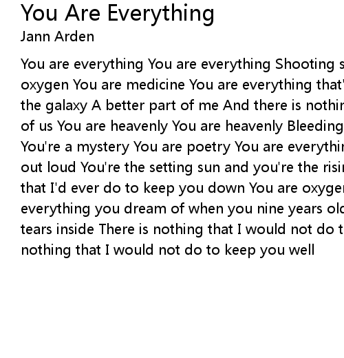 You are everything You are everything Shooting star, you are everywhere You are oxygen You are medicine You are everything that's good about the universe You're the galaxy A better part of me And there is nothing that is bigger than the two of us You are heavenly You are heavenly Bleeding heart, hanging on your sleeve You're a mystery You are poetry You are everything that makes me want to laugh out loud You're the setting sun and you're the rising one And there is nothing that I'd ever do to keep you down You are oxygen You are medicine You are everything you dream of when you nine years old You are open wide A million tears inside There is nothing that I would not do to keep you well No, there is nothing that I would not do to keep you well |