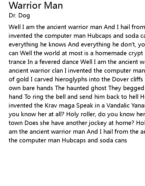 | Well I am the ancient warrior man And I hail from the ancient warrior clan I invented the computer man Hubcaps and soda cans Well the holy ghost, he owes me everything he knows And everything he don't, you understand? Well I think you can Well the world at most is a homemade crypt I made from my rib in a lightning trance In a fevered dance Well I am the ancient warrior man And I hail from the ancient warrior clan I invented the computer man Hubcaps and soda cans The roads of gold I carved hieroglyphs into the Dover cliffs I'm a self-made man with my own bare hands The haunted ghost They begged for the man with the hammer in his hand To ring the bell and send him back to hell Holy roller, do you know her? I invented the Krav maga Speak in a Vandalic Yanamamö patois Holy roller, do you know her at all? Holy roller, do you know her? Gonna need another ride into town Does she have another jockey at home? Holy roller, do you know her Well I am the ancient warrior man And I hail from the ancient warrior clan I invented the computer man Hubcaps and soda cans |