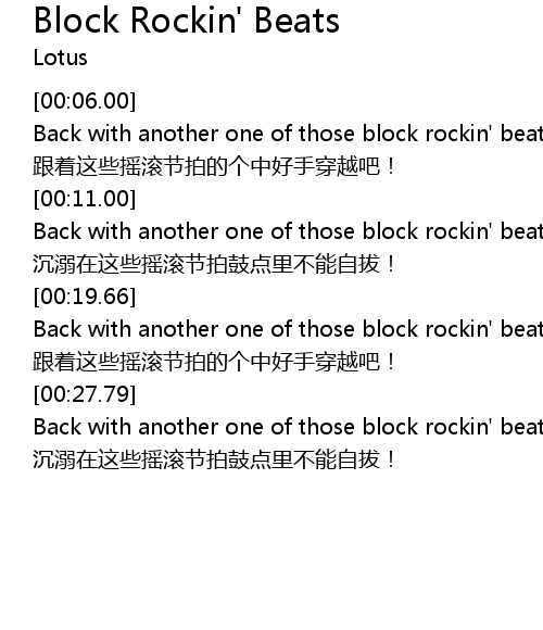 | [00:15.31] | Back with another one of those block rockin' beats! 沉溺在这些摇滚节拍鼓点里不能自拔! |