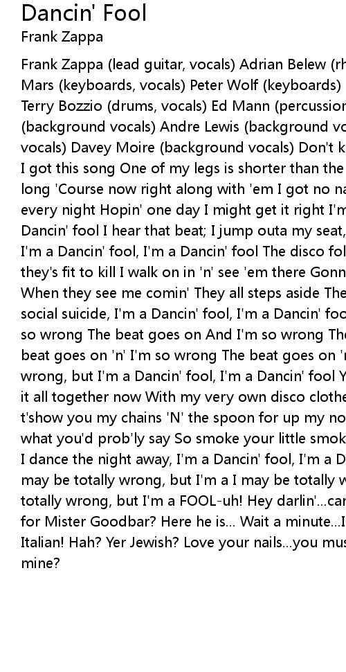Frank Zappa (lead guitar, vocals) Adrian Belew (rhythm guitar, vocals) Tommy Mars (keyboards, vocals) Peter Wolf (keyboards) Patrick O'Hearn (bass, vocals) Terry Bozzio (drums, vocals) Ed Mann (percussion, vocals) Napoleon Murphy Brock (background vocals) Andre Lewis (background vocals) Randy Thornton (background vocals) Davey Moire (background vocals) Don't know much about dancin' That's why I got this song One of my legs is shorter than the other 'N' both my feet's too long 'Course now right along with 'em I got no natural rhythm But I go dancin' every night Hopin' one day I might get it right I'm a dancin' fool, I'm a Dancin' fool I hear that beat; I jump outa my seat, But I can't compete, 'cause I'm a Dancin' fool, I'm a Dancin' fool The disco folks all dressed up Like they's fit to kill I walk on in 'n' see 'em there Gonna give them all a thrill When they see me comin' They all steps aside They has a fit while I commit My social suicide, I'm a Dancin' fool, I'm a Dancin' fool The beat goes on And I'm so wrong The beat goes on And I'm so wrong The beat goes on 'n' I'm so wrong The beat goes on 'n' I'm so wrong The beat goes on 'n' I'm so wrong I may be totally wrong, but I'm a Dancin' fool, I'm a Dancin' fool Youwsa, youwsa, youwsa I got it all together now With my very own disco clothes, hey! My shirt's half open, t'show you my chains 'N' the spoon for up my nose I am really somethin' That's what you'd prob'ly say So smoke your little smoke Drink your little drink While I dance the night away, I'm a Dancin' fool, I'm a Dancin' fool, (etc., etc.) I may be totally wrong, but I'm a I may be totally wrong, but I'm a I may be totally wrong, but I'm a FOOL-uh! Hey darlin'...can I buy ya a drink? Lookin' for Mister Goodbar? Here he is... Wait a minute...I've got it...You're an Italian! Hah? Yer Jewish? Love your nails...you must be a Libra... Your place or mine? |