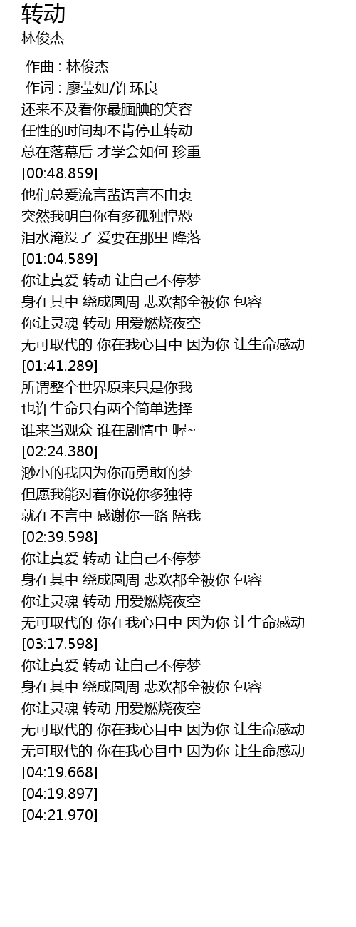 | [02:39.689] | 你让真爱 转动 让自己不停梦 |