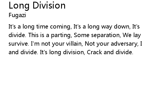 | It's a long time coming, It's a long way down, It's long division, Crack and divide. This is a parting, Some separation, We lay in pieces, Cracked to survive. I'm not your villain, Not your adversary, I'm not your reason to crack and divide. It's long division, Crack and divide. |