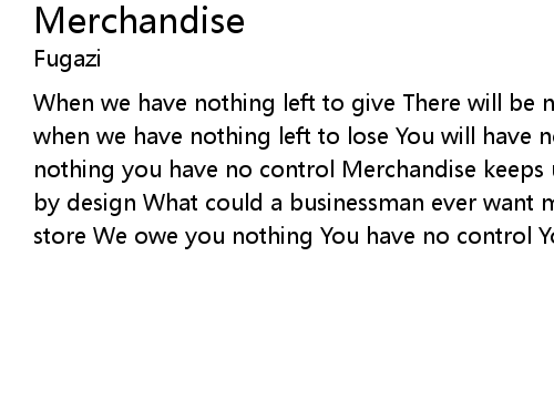 | When we have nothing left to give There will be no reason for us to live But when we have nothing left to lose You will have nothing left to use We owe you nothing you have no control Merchandise keeps us in line Common sense says it's by design What could a businessman ever want more than to have us sucking in his store We owe you nothing You have no control You are not what you own |