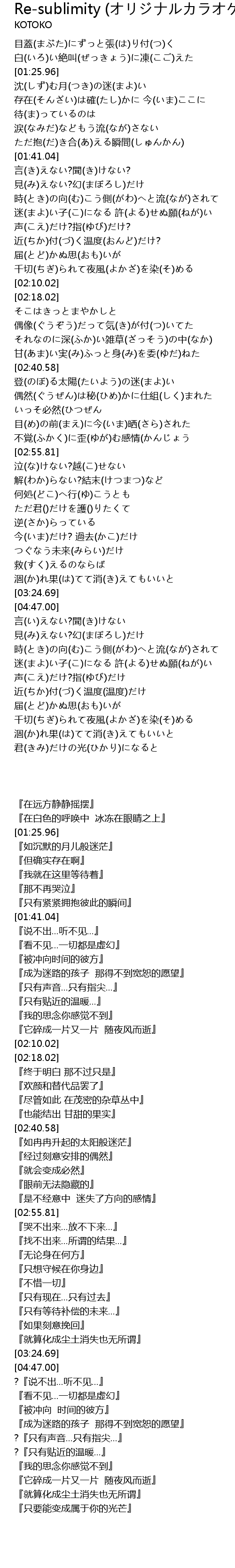 | [01:22.07] | 白(いろ)い絶叫(ぜっきょう)に凍(こご)えた |