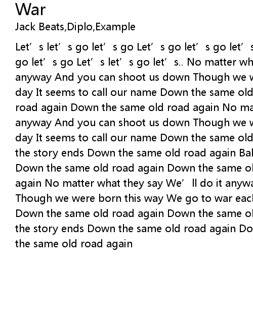 | Let' s let' s go let' s go Let' s go let' s go let' s.. Let' s go let' s go let' s go Let' s let' s go let' s.. No matter what they say We' ll do it anyway And you can shoot us down Though we were born this way We go to war each day It seems to call our name Down the same old road again Down the same old road again Down the same old road again No matter what they say We' ll do it anyway And you can shoot us down Though we were born this way We go to war each day It seems to call our name Down the same old road again Baby, here' s where the story ends Down the same old road again Baby, here' s where the story ends Down the same old road again Down the same old road again Down the same old road again No matter what they say We' ll do it anyway And you can shoot us down Though we were born this way We go to war each day It seems to call our name Down the same old road again Down the same old road again Baby, here' s where the story ends Down the same old road again Down the same old road again Down the same old road again |