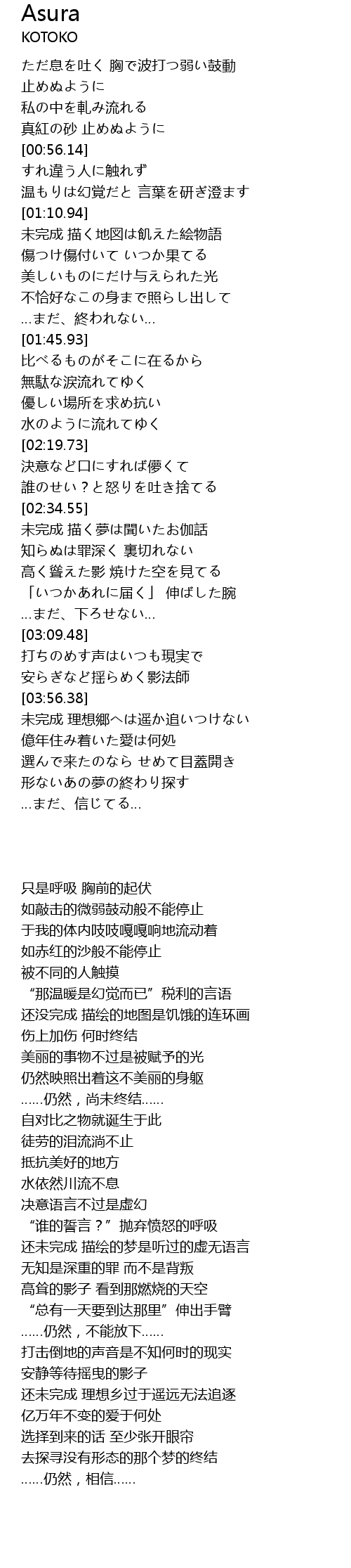 | [[00:40.19] | ただ息を吐く 胸で波打つ弱い鼓動 |