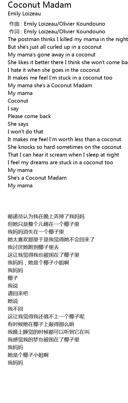 | [00:37.33] | My mama she' s a Coconut Madam |