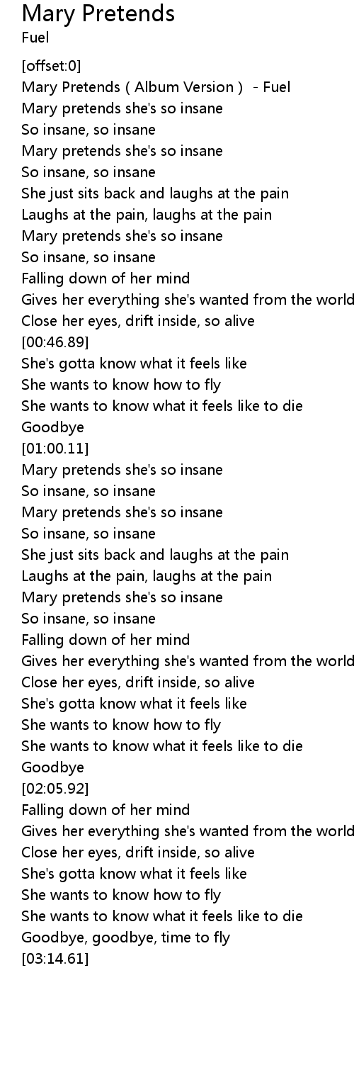| [00:01.69] | Mary Pretends Album Version Fuel |
