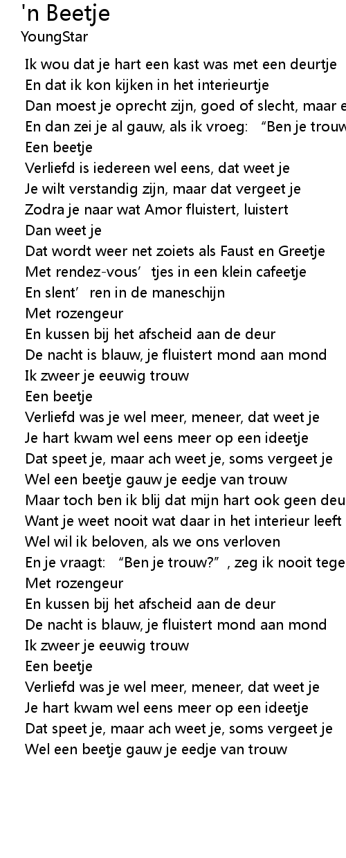 | [01:46.936] | En je vraagt: " Ben je trouw?", zeg ik nooit tegen jou |