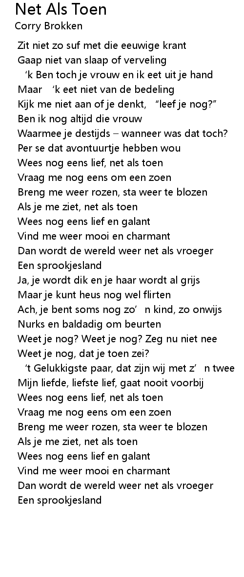 | [01:58.247] | Weet je nog? Weet je nog? Zeg nu niet nee |