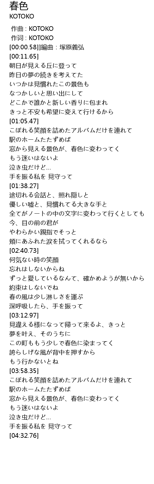| [04:12.33] | 窓から見える景色が、春色に変わってく |