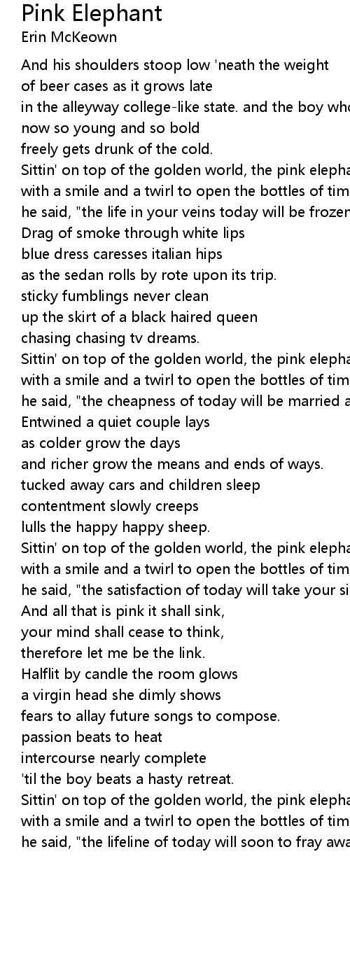 Sittin' on top of the golden world, the pink elephant emerges, |