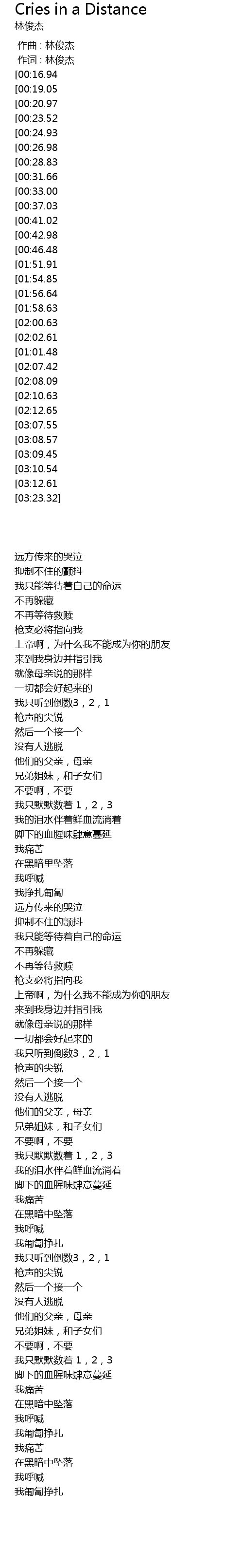 | [01:21.04][00:16.94] | Cries in a distance |