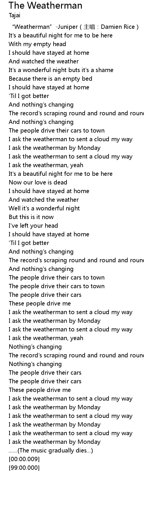 | [00:00.100] | " Weatherman" Juniper zhǔ chàng: Damien Rice |