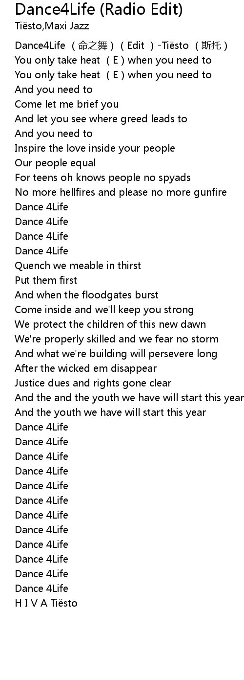 | [00:00.00] | Dance4Life (命之舞)(Edit )-Tiësto (斯托) |