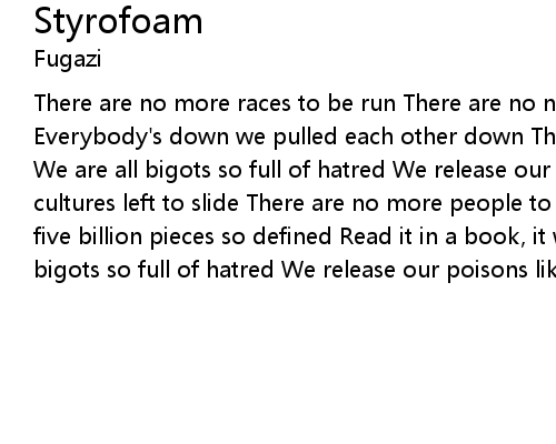 | There are no more races to be run There are no numbers left to be won Everybody's down we pulled each other down There never was a truth to be found We are all bigots so full of hatred We release our poisons There are no more cultures left to slide There are no more people to be tried We're in our minds five billion pieces so defined Read it in a book, it was underlined We are all bigots so full of hatred We release our poisons like styrofoam |