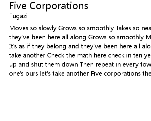 | Moves so slowly Grows so smoothly Takes so neatly It's as if they belong and they've been here all along Grows so smoothly Moves so slowly Takes completely It's as if they belong and they've been here all along This one's ours let's take another Check the math here check in ten years Clusterfuck theory buy them up and shut them down Then repeat in every town Every town will be the same This one's ours let's take another Five corporations there is a pattern |