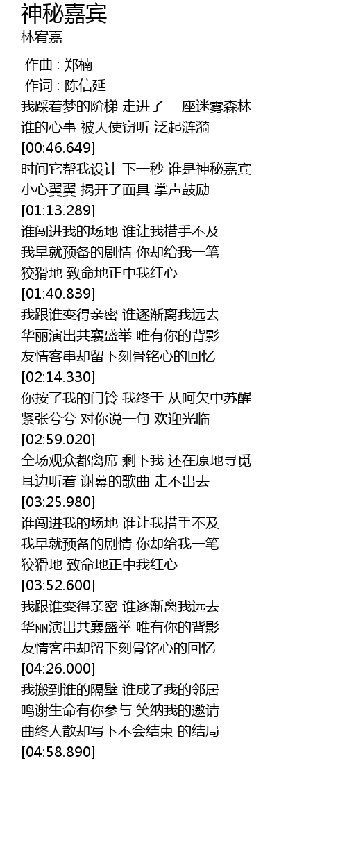 | [00:52.619] | 时间它帮我设计 下一秒 谁是神秘嘉宾 |