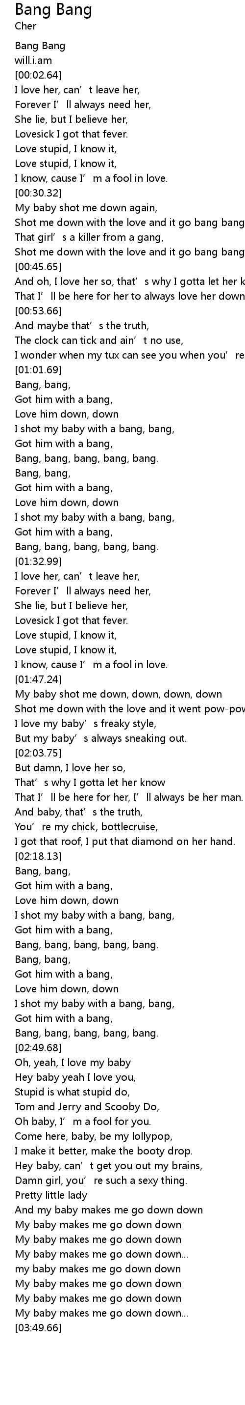 | [02:41.01] | I shot my baby with a bang, bang, |