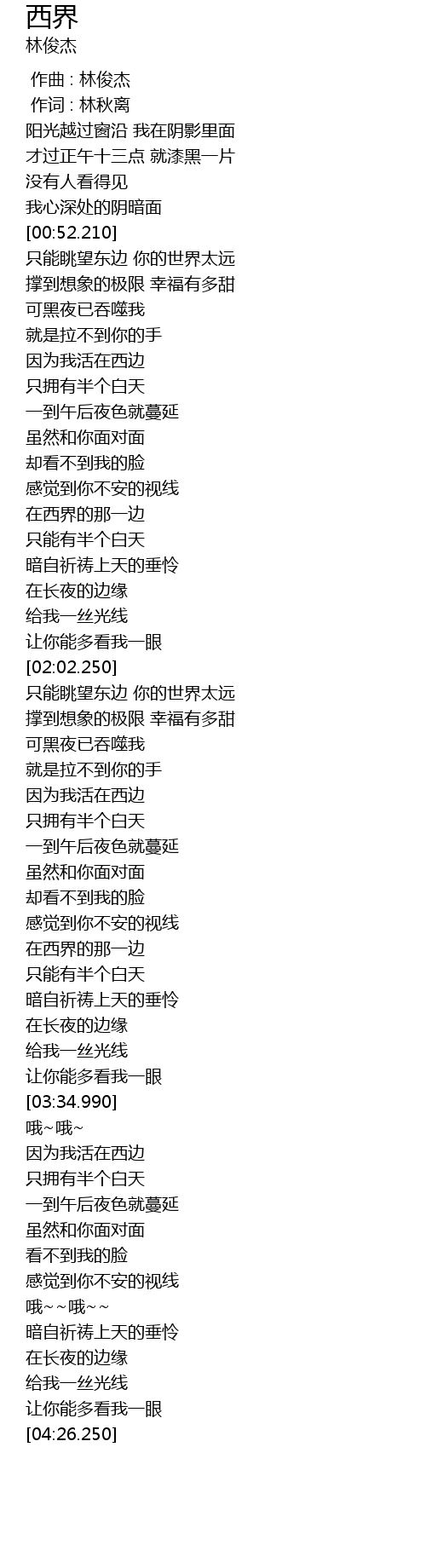 | [02:26.650] | 只能眺望东边 你的世界太远 |