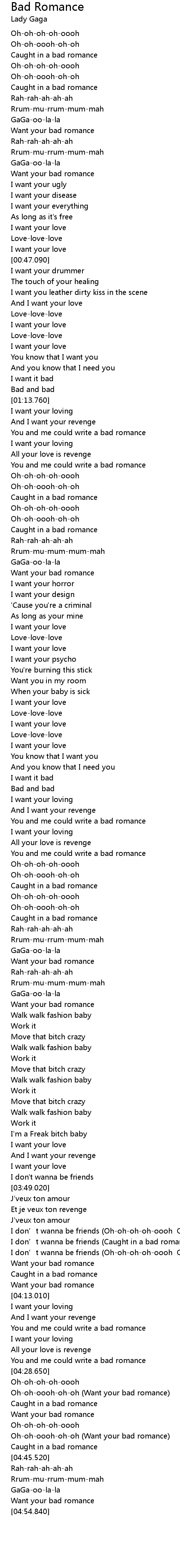 | [04:30.830] | Oh-oh-oooh-oh-oh (Want your bad romance) |