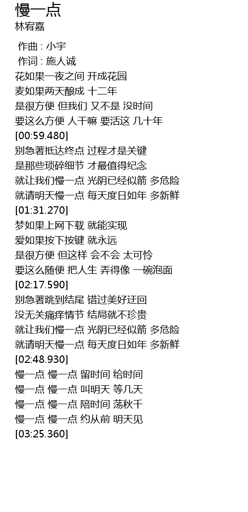 | [02:57.520] | màn yì diǎn màn yì diǎn jiào míng tiān děng jǐ tiān |