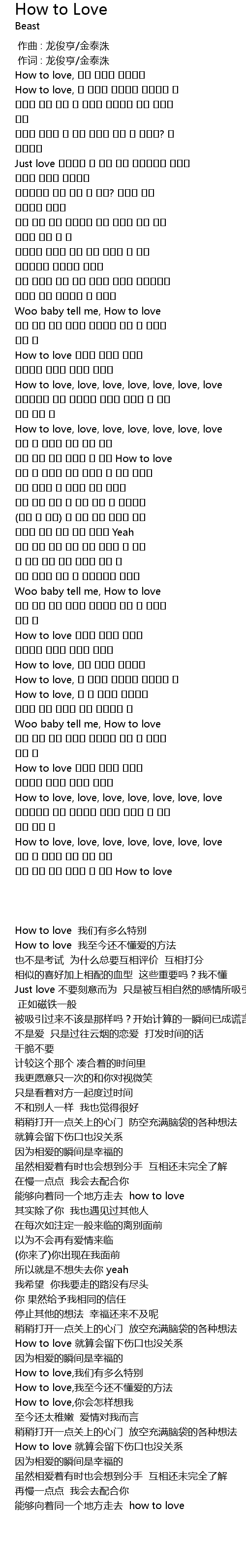 | [02:27.119] | Woo baby tell me, How to love |