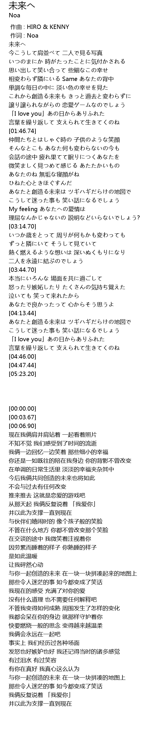 | [01:15.00] | これから創造る未来も きっと過去と変わらずに |