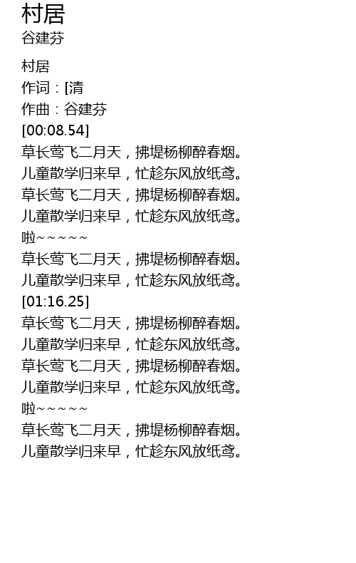 | [01:26.58] | 草长莺飞二月天,拂堤杨柳醉春烟。 |