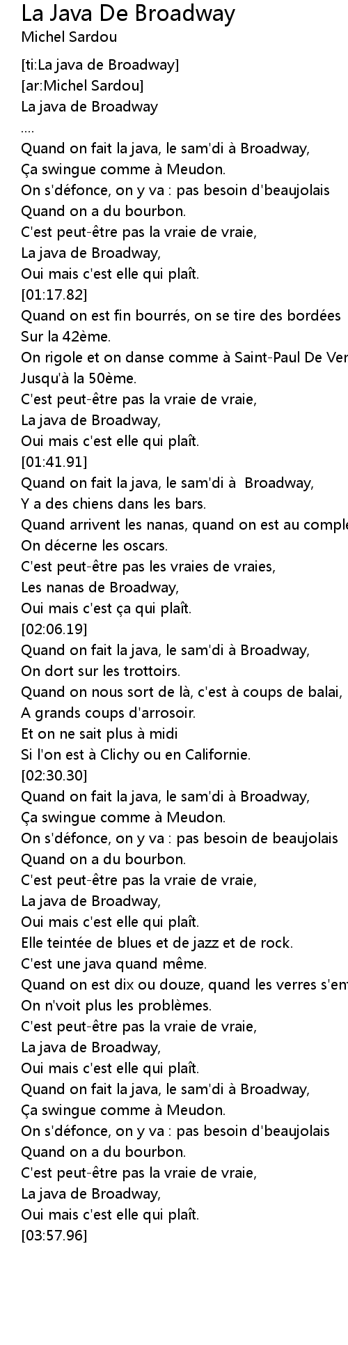 | [01:42.76] | Quand on fait la java, le sam' di a Broadway, |