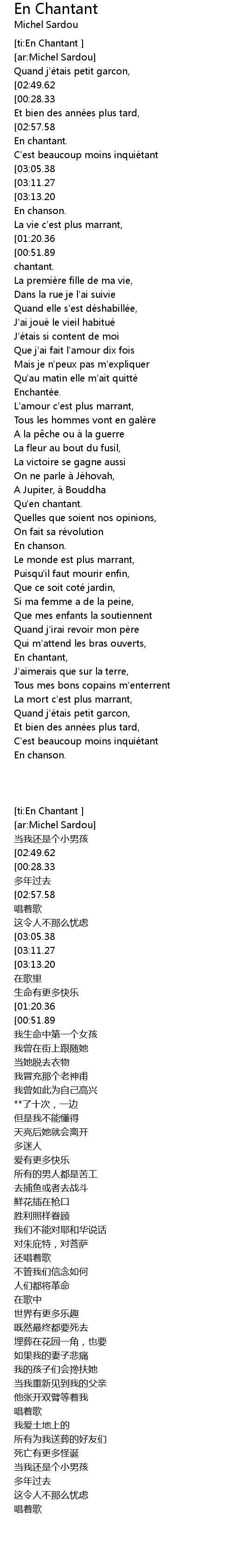 | [00:12.72][00:28.33][01:07.80][02:52.20][03:08.04] | En chantant |