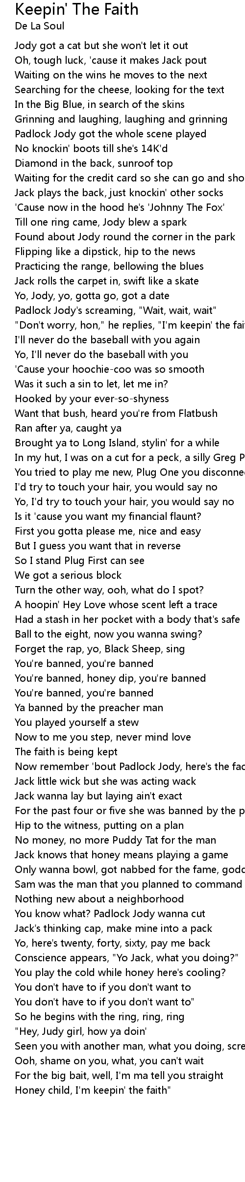 Honey child, I'm keepin' the faith" |