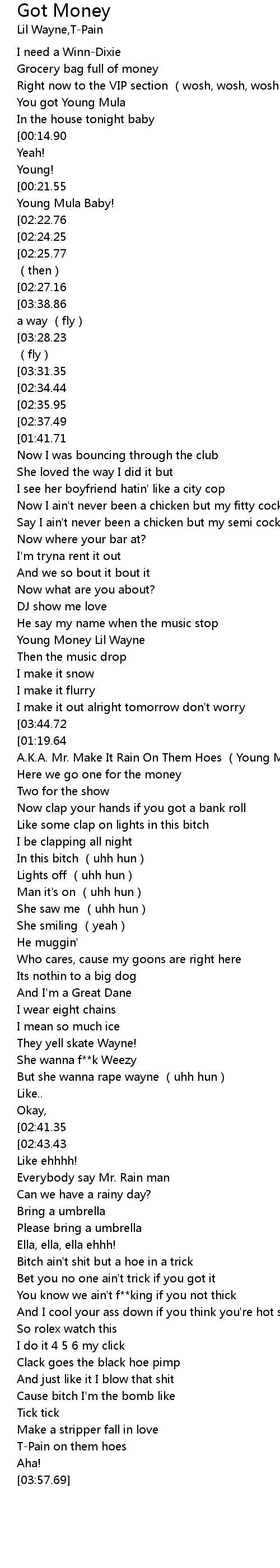 | [01:21.86] | A. K. A. Mr. Make It Rain On Them Hoes Young Money |
