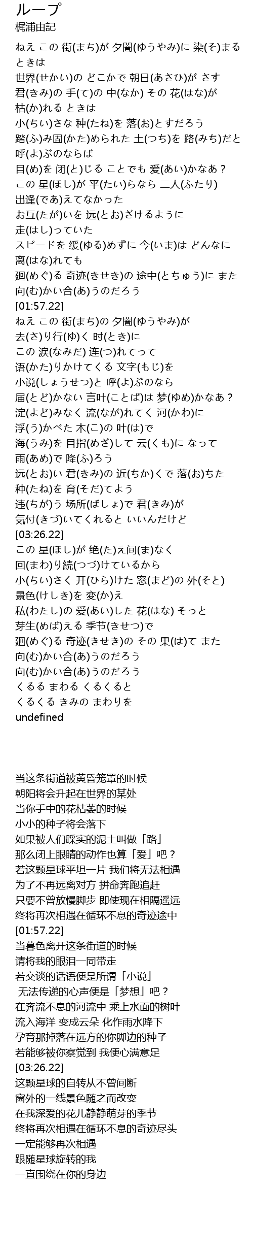 | [01:16.37] | この 星(ほし)が 平(たい)らなら 二人(ふたり) 出逢(であ)えてなかった |