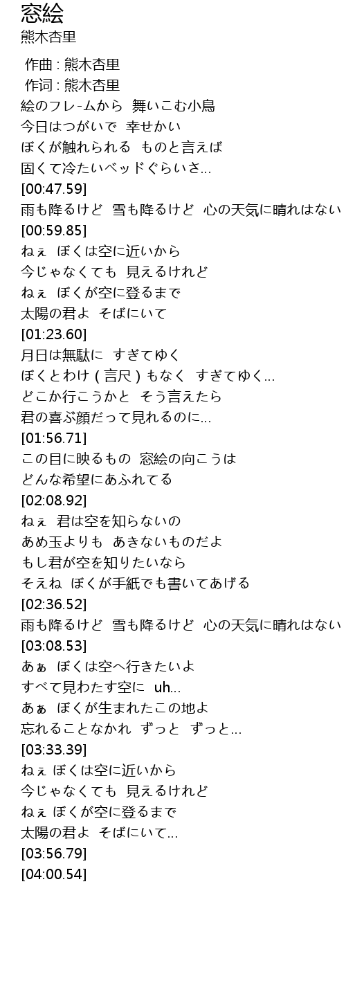 | [00:24.10] | 絵のフレ-ムから 舞いこむ小鳥 |