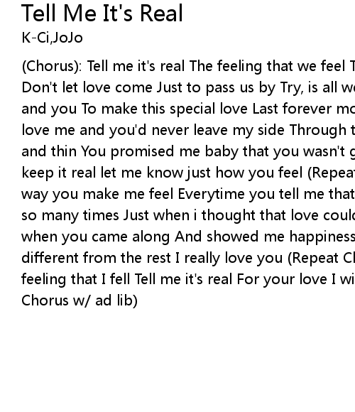 | (Chorus): Tell me it's real The feeling that we feel Tell me that it's real Don't let love come Just to pass us by Try, is all we have to do It's up to me and you To make this special love Last forever more Baby you told me that you love me and you'd never leave my side Through the bitter end through the thick and thin You promised me baby that you wasn't going anywhere, yes you did Baby keep it real let me know just how you feel (Repeat Chorus) I can't explain the way you make me feel Everytime you tell me that you love me And you know you did so many times Just when i thought that love could never be a part of me That's when you came along And showed me happiness Baby you are the best I think you're different from the rest I really love you (Repeat Chorus) Tell me it's real This feeling that I fell Tell me it's real For your love I will do anything (Repeat Chorus w/ ad lib) |