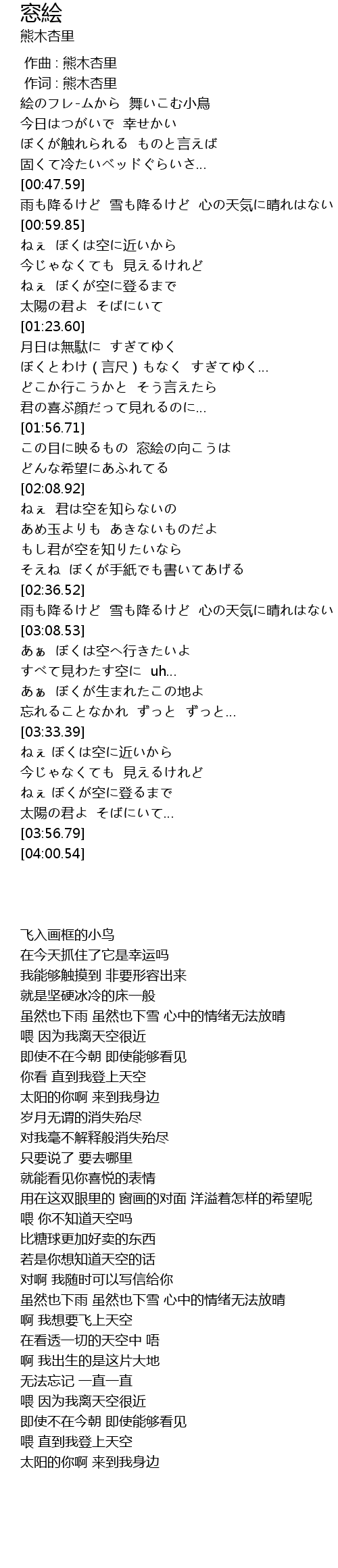 | [00:24.10] | 絵のフレ-ムから 舞いこむ小鳥 |