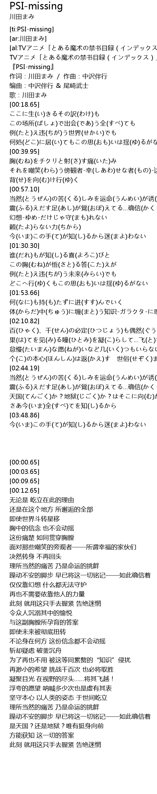 | [00:00.65] | TVアニメ「とある魔术の禁书目録(インデックス)」OPテーマ |