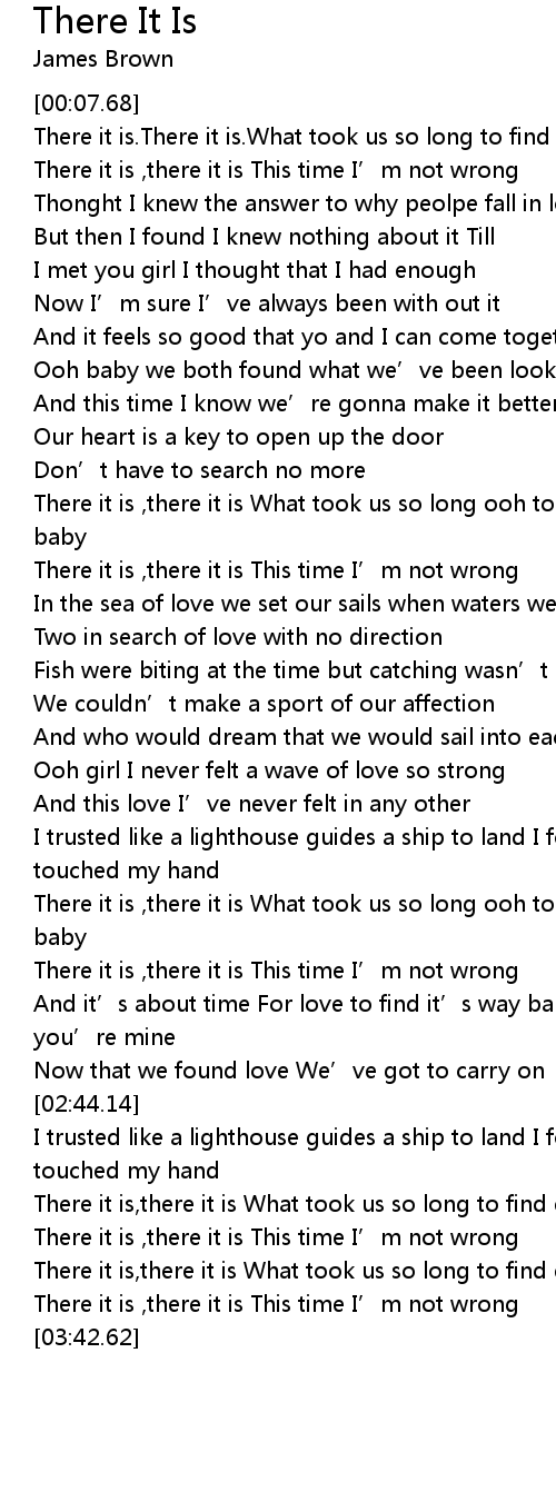 | [01:14.73] | There it is , there it is What took us so long ooh to find each other baby |