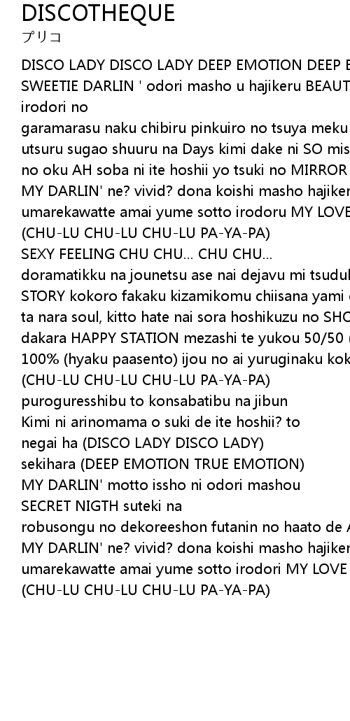 doramatikku na jounetsu ase nai dejavu mi tsuduke taku te karafuru na SWEETY STORY kokoro fakaku kizamikomu chiisana yami ga otozure te mo koi no jumon tonae ta nara soul, kitto hate nai sora hoshikuzu no SHOWER ga furisosogu |