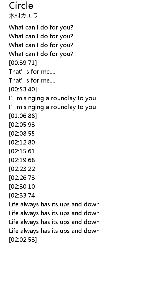 | [03:43.34][02:05.93][01:10.23] | It' s like a circle |