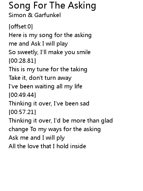 | [00:13.43] | Here is my song for the asking |