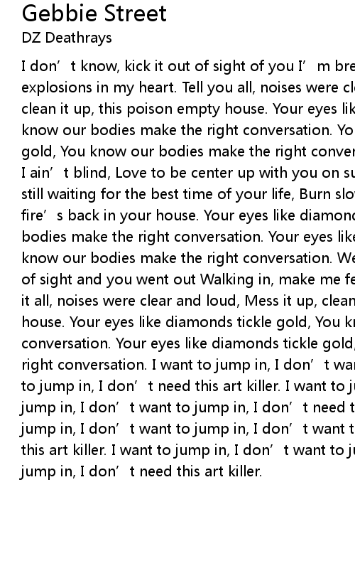 | I don' t know, kick it out of sight of you I' m breaking in, you make me feel explosions in my heart. Tell you all, noises were clear and loud Mess it up, clean it up, this poison empty house. Your eyes like diamonds tickle gold, You know our bodies make the right conversation. Your eyes like diamonds tickle gold, You know our bodies make the right conversation. I could see color up but I ain' t blind, Love to be center up with you on sunrays shine. You ran away, still waiting for the best time of your life, Burn slow, breaking up, this fire' s back in your house. Your eyes like diamonds tickle gold, You know our bodies make the right conversation. Your eyes like diamonds tickle gold, You know our bodies make the right conversation. Well, I don' t know, get you out of sight and you went out Walking in, make me feel explosions in my brain. Play it all, noises were clear and loud, Mess it up, clean it up, this poison empty house. Your eyes like diamonds tickle gold, You know our bodies make the right conversation. Your eyes like diamonds tickle gold, You know our bodies make the right conversation. I want to jump in, I don' t want to jump in, I don' t want to jump in, I don' t need this art killer. I want to jump in, I don' t want to jump in, I don' t want to jump in, I don' t need this art killer. I want to jump in, I don' t want to jump in, I don' t want to jump in, I don' t need this art killer. I want to jump in, I don' t want to jump in, I don' t want to jump in, I don' t need this art killer. |