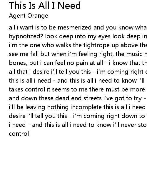 all i want is to be mesmerized and you know what does those things to me hypnotized? look deep into my eyes look deep into my eyes and you will see that i'm the one who walks the tightrope up above the heads of many who would love to see me fall but when i'm feeling right, the music never stops i'm breaking bones, but i can feel no pain at all - i know that this is all i need - this is all that i desire i'll tell you this - i'm coming right down to the wire again this is all i need - and this is all i need to know i'll be lost until the music takes control it seems to me there must be more to life you know than racing up and down these dead end streets i've got to try - out here it's do or die and i'll be leaving nothing incomplete this is all i need - this is all that i desire i'll tell you this - i'm coming right down to the wire again this is all i need - and this is all i need to know i'll never stop until the music takes control |