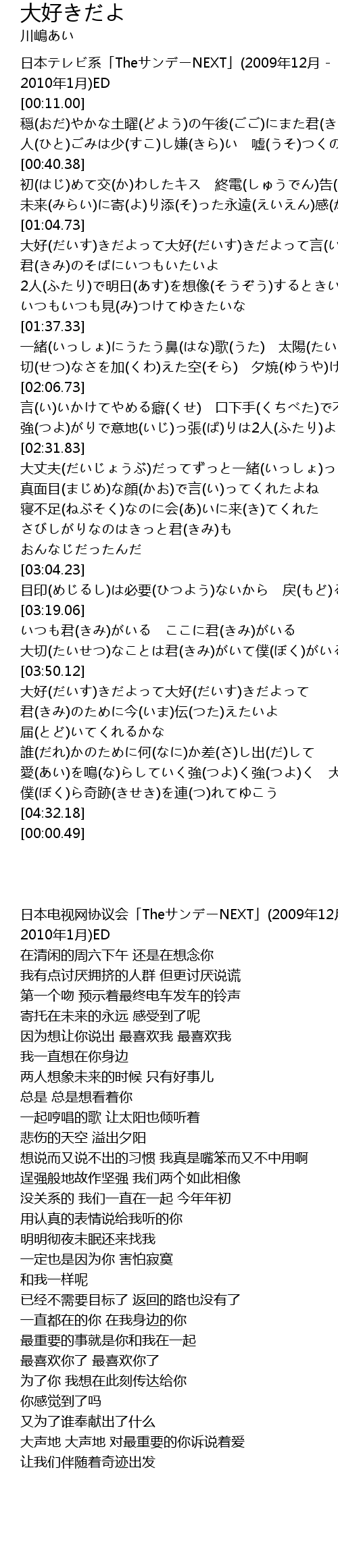 | [03:51.17] | 大好(だいす)きだよって大好(だいす)きだよって |