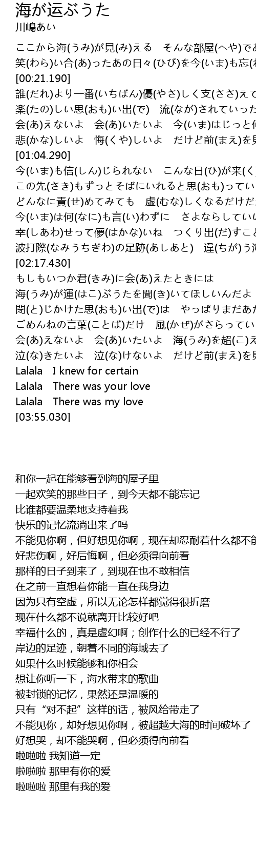 | [02:28.940] | 海(うみ)が運(はこ)ぶうたを聞(き)いてほしいんだよ |